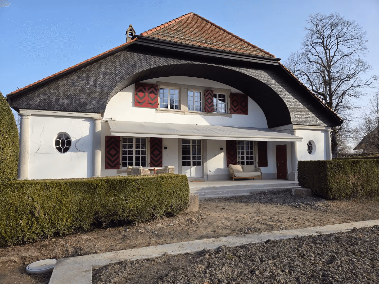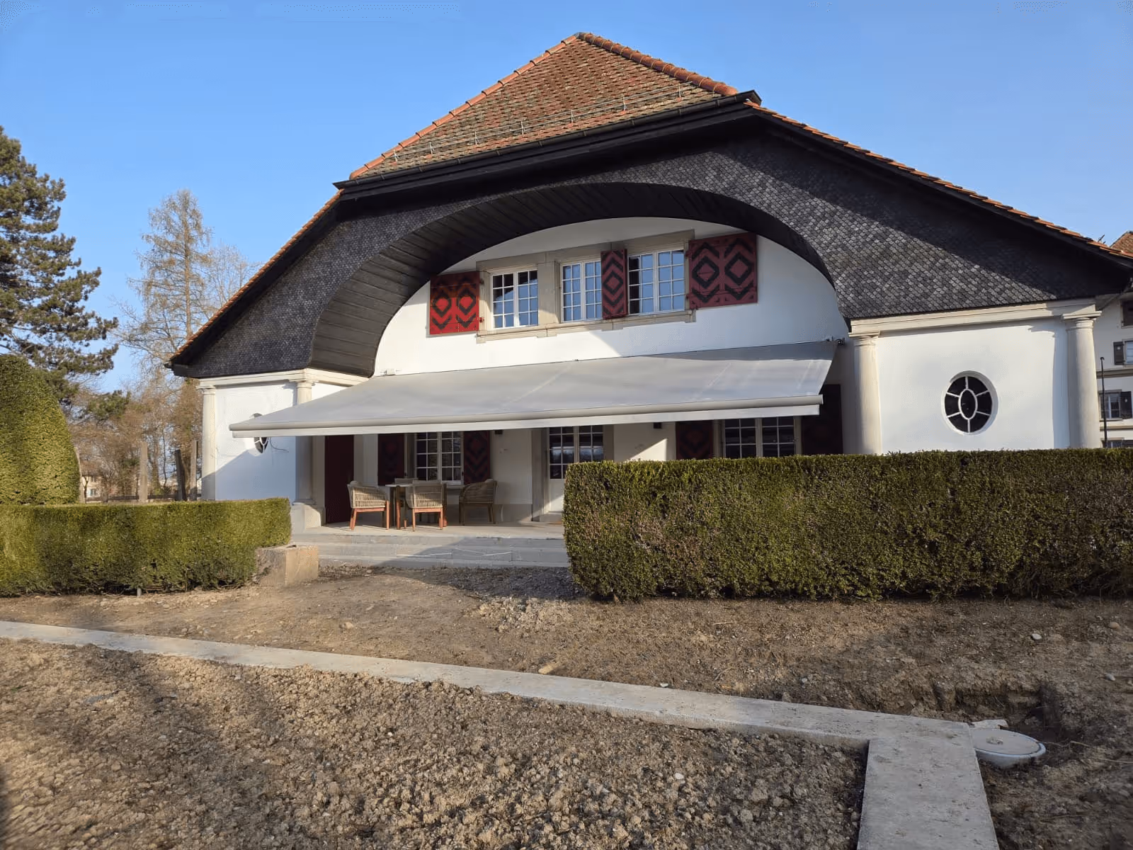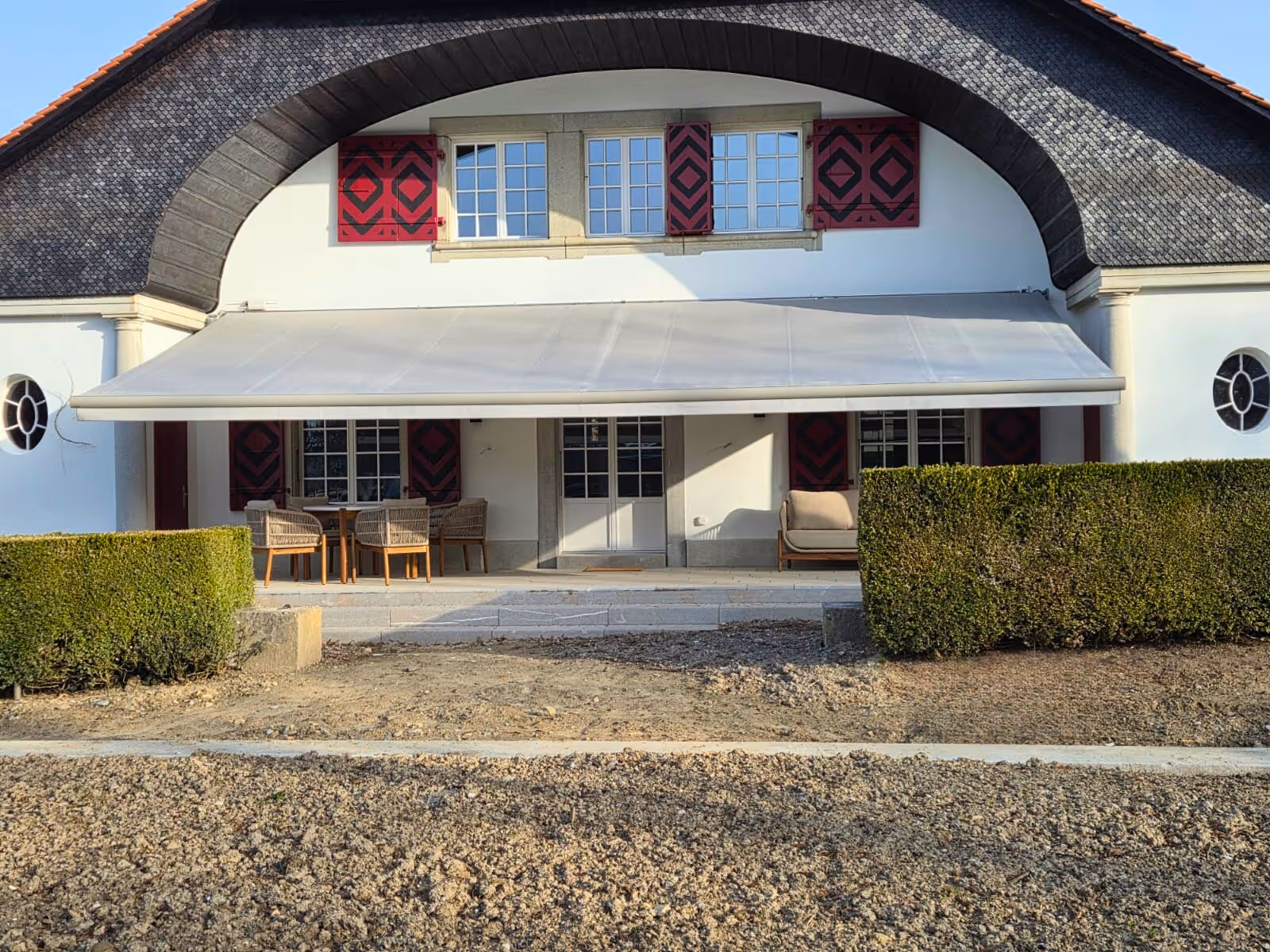 Eine besondere Herausforderung stellte die grosse Sonnenstore dar. Aufgrund ihrer aussergewöhnlichen Breite wurde sie in mehreren Einzelteilen angeliefert. Diese mussten vor Ort von vier Monteuren präzise zusammengesetzt werden, bevor die Anlage montiert und exakt ausgerichtet werden konnte. Solche Dimensionen erfordern nicht nur sorgfältige Planung, sondern auch eingespielte Teamarbeit auf der Baustelle. Das Resultat ist eine grosszügige, funktionale Beschattung, die sich harmonisch in das Gebäude integriert und den Aussenbereich deutlich aufwertet.